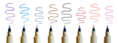 Art markers are either water based (with a dye, pigment or paint), oil based (will write on nearly anything) or alcohol based (fast drying for even colour). Water-based markers blend well, whereas pigmented markers are more colourfast and water-resistant. Popular fineliner brands are UNI Pin and Pigma Micron. For wider lines and more colour choice see the dye-based TOMBOW ABT Brush Pens or pigmented Pitt Artist Brush Pens which are more lightfast. The most popular gel pen is UNI Signo Gel for it's pigment vibrancy, as the gel tends to stay on the paper surface. Paint markers are the most opaque and a lot of fun for decorating windows, skateboards, surfboards etc. For a more detailed comparison of different brush markers, see our Top 7 Watercolour Brush Markers and Top 7 Pigmented Brush Markers.