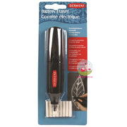 The battery operated Eraser-Pen features a highly effective eraser for detailed and accurate erasing; presented in a convenient pen style holder with a stylish comfort-grip barrel. Comes on a blister pack with 8 replacement erasers.