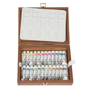 This set includes a Porcelain Palette and the colours included in the set are: Lemon Yellow, Cadmium Yellow Light, Chromium Yellow Hue Light, Chrome Orange, Cadmium Red Light, Perylene Maroon, Permanent Carmine, Magenta, Manganese Violet, Indigo, Ultramarine Finest, Prussian Blue, Helio Cerulean, Helio Turquoise, Phthalo Green, May Green, Cobalt Green Deep, Permanent Green Olive, Naples Yellow, Yellow Ochre, Burnt Sienna, English Venetian Red, Sepia Brown and Ivory Black.