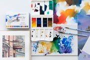Supplied as semi-moist full pans, you get a lot of paint that instantly rewets, but is also easily transportable. The large pan size means the paint is easy to access and you can also use a larger brush size. Good for when you are doing washes or working in a larger sketchbook.