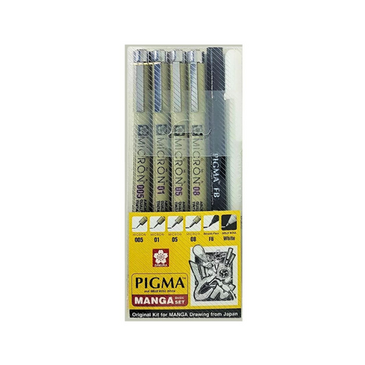 SAKURA Pigma Manga Basic 6 Pen Set contains one each black ink Pigma Micron pens in sizes 005, 01, 05, 08 plus a PIGMA Professional Black Fine Brus...
