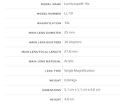 Eye piece diametre is 25mm. Uses a 36 Dioptre lens with a focal length is 27.8mm.