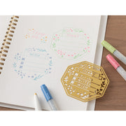 This brass template allows you to easily draw illustrations in your diary or notebook by simply tracing it with your favorite pen. In addition to cute animals and easy-to-use motifs, you can also write titles and to-do lists. It is designed to be completed as an illustration on one sheet. It is also recommended for arranging sticky notes and memos. You can trace only the parts you need or arrange them in your favorite colors, so the range of uses is wide. The back is treated with an anti-slip coating to prevent it from slipping when writing. The main body is made of brass and is very thin at 0.4 mm, so it does not get in the way when you carry it between your diary or notebook.