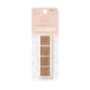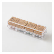 These are ink-impregnated stamps. This set includes four soft, original colours (pink, purple, blue, and green) that won't interfere with your notebook decorations. The body is made of cork, which cushions your fingers when you press.