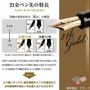 Beautifully smooth 21K gold nib available in Fine, Medium, Broad, Zoom (for line variation) and Music (for expressive flourishes).