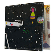 Made of durable vinyl (double layer for extra strength). The wallet is 21 x 9.5 cm open, but folds perfectly to fit in your pocket (10 x 9.5 cm). All wallets are limited edition and come with a matching badge/pin.