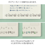 These roller-type stamps are perfect for making notes in your notebook or diary. They're pre-inked, so no ink pad is needed. With just one stamp, you can beautifully stamp three connected, delicate designs. They'll add a vibrant touch to any white space on the page, as well as the spaces above and below.