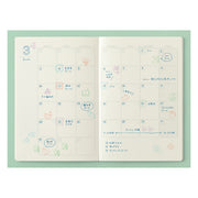 These stamps feature four different animal designs: rabbit, cat, koala, and monkey. By combining the stamps along the notebook's lines, you can create peeking or hanging poses. Adding speech bubbles adds a lively touch.