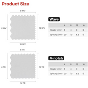 Set includes four tools, including Wave Edge (for flowing patterns), V-notch (for adhesive control), Square notch (for clean edge grooves) and Straight Edge (for smoothing over wider area).
