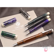 The pen is filled with the supplied eyedropper and uses a piston operated shut-off valve to seal the barrel when travelling or flying. When writing for exteded periods of time release the piston to enable ink flow to the feed and nib.