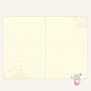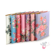 They contain lovely 100gsm cream coloured paper with line spacing of 6.5mm. Inside the pages are lightly printed with a matching floral pattern while the notebook edge is gold gilt. The outside is fabric covered with a screen printed floral pattern.