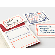 The refill cover features a wine-red design and the pages are made of MD cream paper. The first and last pages are perforated for easy removal and they feature a message card with the theme LOVE AND TRIP created using letterpress printing. The number of message cards varies depending on the size.
