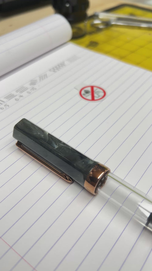 The long awaited restock of the Serpentine with bronze coloured trimmed. This is a mixed resin pour of colours representing the mottled greens and browns of the 'snake-like' serpentine stone. The attached images are examples of possible colours, but please know each pen pattern is unique. We have seen combinations ranging from dark mixed greens to some with bright white and orange highlights. Boxes are sealed.